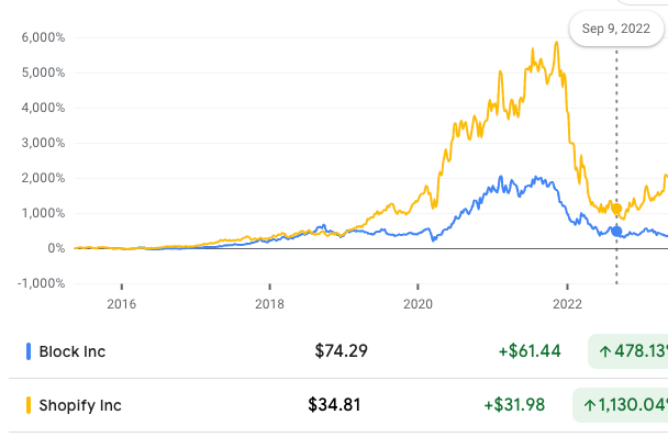 3. Stocks go way up across the board (ie Mid-2020 to early 2022), especially growth stocks like Square/Block, Shopify, etc. There are other factors here (perhaps a growing tech bubble, investor expectations, etc), but with more money people can bid higher for stocks. Also with growth stocks the cash flow is way in the future, so having low interest rate alternatives in the present (bonds / loaning out money) makes stocks the more attractive investment for banks (EDIT: see a simplified cash flow example of the reverse, where stocks go down as interest rates rise, in section 1 here).
