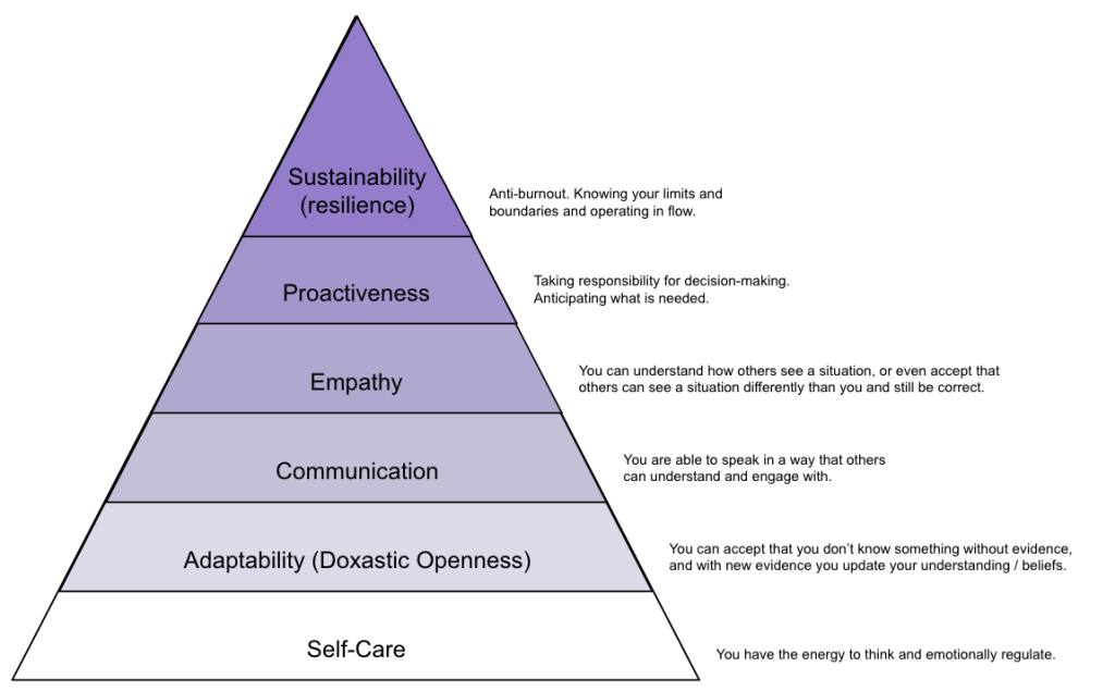 - Self-care (e.g. you can’t focus if you’re starving). This is the foundation off which other skills are based. I’ll define self-care here as: having resources to think effectively (i.e. you are not in an emotional or health crisis). Basically it’s the actual Maslow’s hierarchy of needs lower levels, in that basic needs are met, so you have the energy to work on a team. No one wants someone on their team who cannot take care of themselves to some degree. Imagine having to count on the work of someone who hasn’t slept for 2 days, is hungover, or just broken up with their partner and wants to talk about it constantly. This can often be overlooked, especially when someone is ‘hustling’ at work. But, for example, someone neglecting their need for emotional intimacy and comfort will usually comes out one way or another. The most common issues I’ve seen recently are (1) isolation during the pandemic – not getting social needs met, and (2) burnout management – not taking adequate time off.