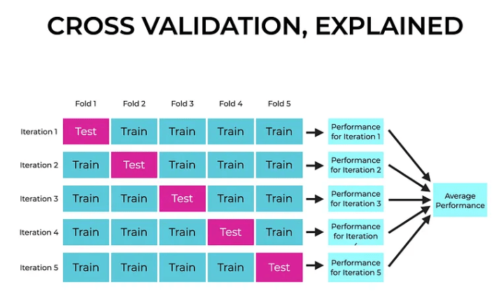 A simple train-test split might be 70/30, but that can be noisy if the test set happens to contain unusual outliers or edge cases. One way to reduce that risk is k-fold cross validation. There, we split the data into k groups, train on all but one, test on the remaining group, and repeat that process across all groups. This gives a better sense of how the model performs across the full dataset (and gives more reliable estimates for errors), rather than relying on one split.